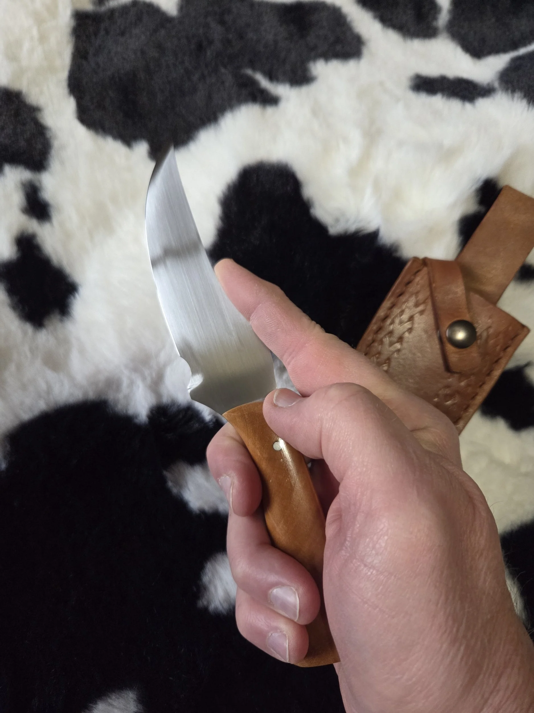 Made with 1095 steel. Blade is 4 ¼ inches and the handle is 3 ¾ inches. The handle is stabilized Cherry wood, with a hand stitched leather sheath.